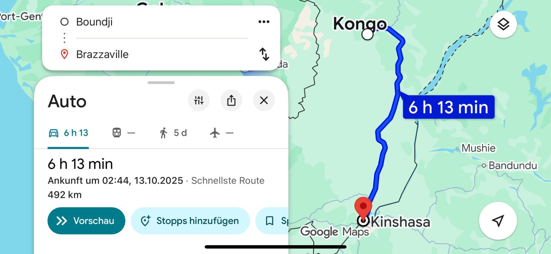Nun, dann erstmal Simkarte kaufen, Instant-Cappuccino beim Bäcker trinken und nachdenken. Was gibt es noch für Möglichkeiten? Wenn der Landweg nicht geht, der Zug ausgebucht ist, es keinen Fluss für den Wasserweg gibt, bleibt nur noch der Luftweg! Glücklicherweise gibt es genügend Flüge pro Tag und wir buchten uns Tickets. Die Motorräder lassen wir natürlich in Moanda stehen, die fliegen nicht mit. Zufrieden kauften wir unglaublich gute, saftige Rosinenschnecken und fuhren zurück zum Hotel. Wir hatten einen Plan!