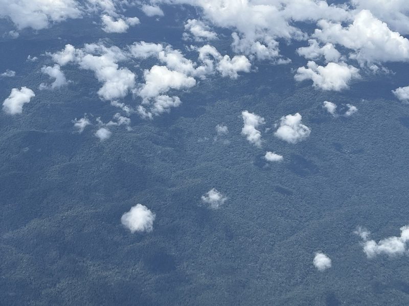 Weil die Flugzeuge Turboprops sind (ATR72) und die Konkurrenz mit Düsenjets schneller fliegt, ist ein Flug mit dem Graupapagei auch der erschwinglichste und ich war richtig glücklich, mit einem Graupapagei über den Regenwald fliegen zu können! Der hatte nämlich im März beim Landeanflug auf Libreville schon so toll ausgesehen: wie ein riesiger Brokkoli! Wir ließen die Motorräder in Moanda stehen, nahmen ein Taxi zum Flughafen und stiegen in den Graupapagei.